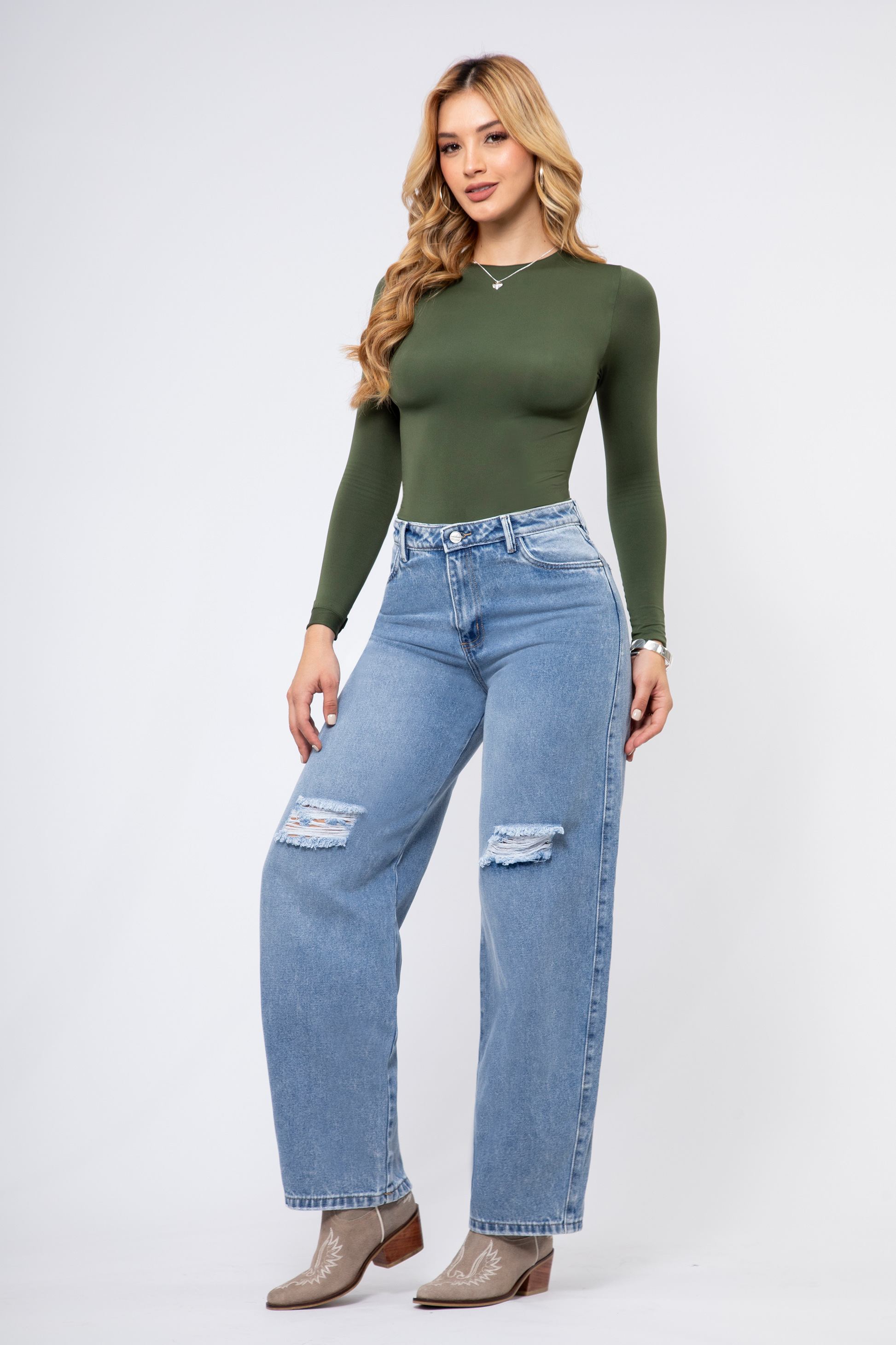 1. Silueta barrel, tiro alto con destroyer en rodilla y detalles desgastados, denim rígido 100% algodón, que da comodidad y comfort.